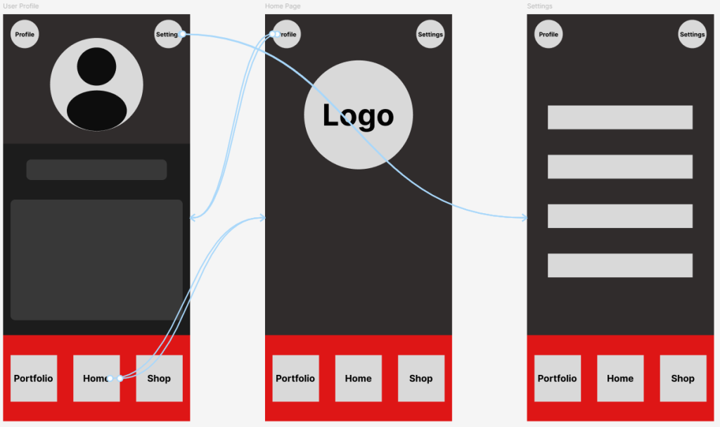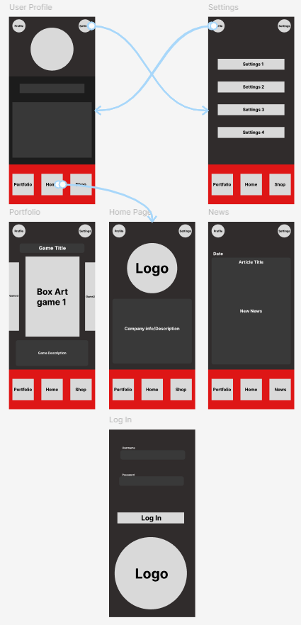 The first of these was the footer menu of the app, inspiration for this was taken from similar companion apps such as the Destiny 2 companion app and the Call of Duty companion app. The footer menu is significant as it will be ever-present throughout the app, and will contain navigation tools to access other important pages (the home, portfolio and shop page). Due to the fact it will be present on most pages, it must both be minimalist in design and size, whilst also being functional and easy to understand. Due to this, multiple variations of this menu were created and tested, by both me and peers, to ensure it felt good to use on a mobile device in addition to not feeling too bulky/obscuring necessary information.